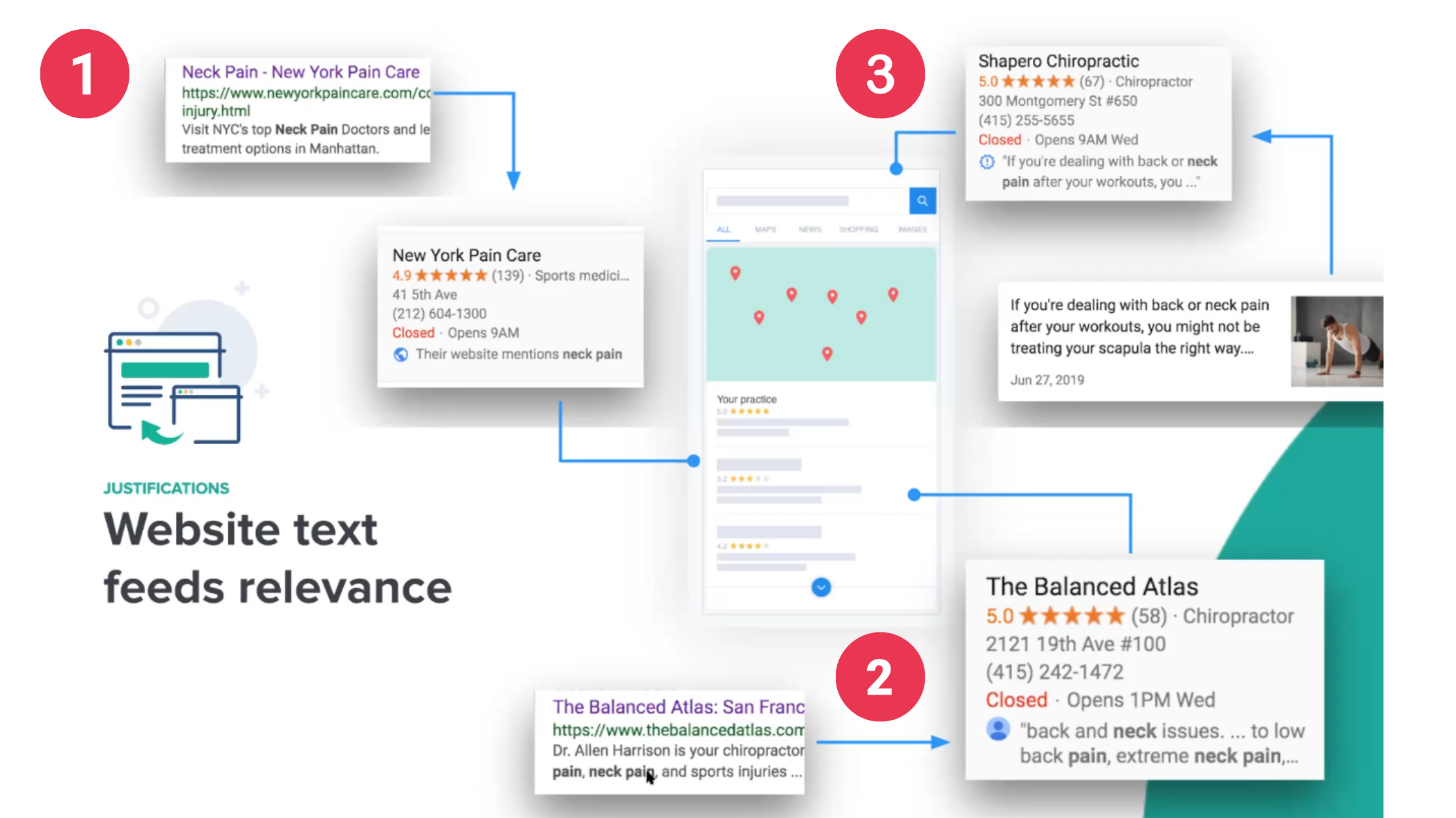 Relevance is the thing that we can control the most. Text content drives query matches – words matter. Without query matches the business won’t rank. When we think about proximity, you can’t control where the searcher is. You can change your location, but that’s very difficult. Prominence, if you’re a new business starting out, you really can’t compete in terms of prominence with other existing businesses – for example you’re a new doctor’s office, you put out a content piece, you won’t be able to compete with Mayo Clinic in terms of prominence. But you can drive relevance.Â