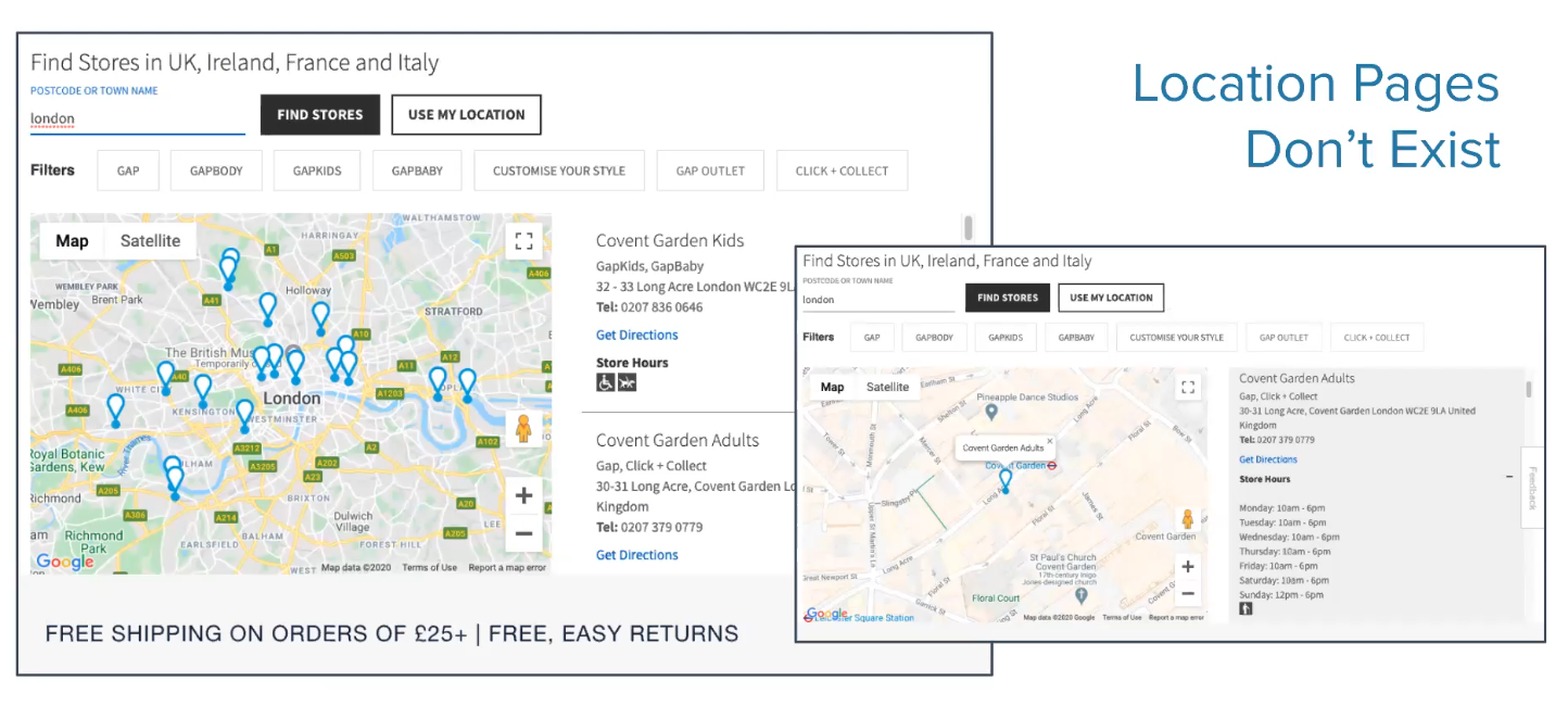 #1. Location Pages Don’t Exist – There’s no individual static URLs for each location, instead one main location page that has all the information for all the locations. This is a terrible user experience – they click to your GMB profile only to be sent to a landing page where ALL the information is stored. Plus it’s terrible for bots too.