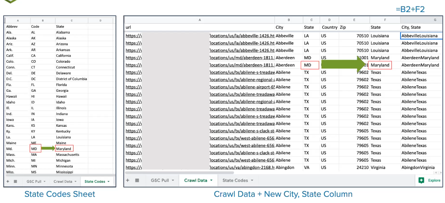 #2. Create a second tab and pull in your crawl data – Crawl URLs and City + State Data
