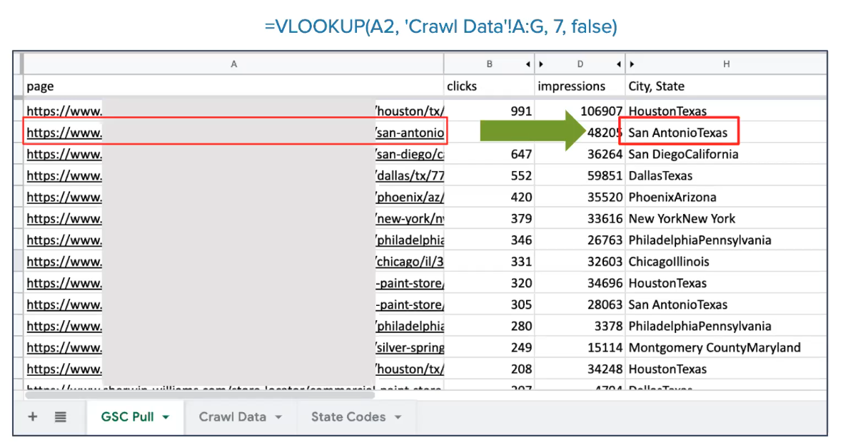 #4. Go back to your GSC tab and use the Vlookup function to pull the City + State data from the crawl data tab into your GSC tab.Â