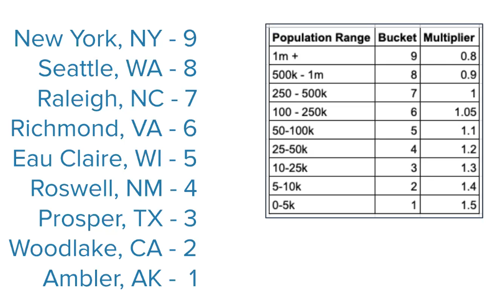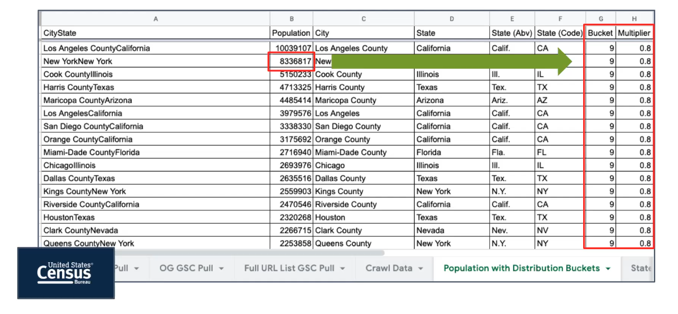 #6. Now create a new tab and pull in all the census data with the city, state, and population. You may need to clean up some of this information, so make sure you review it. Sometimes census data will add “village” after a city name and that can make your data a little messy. Sort population by highest to lowest. Next, manually add your Bucket and the multiplier values from your distribution model.Â