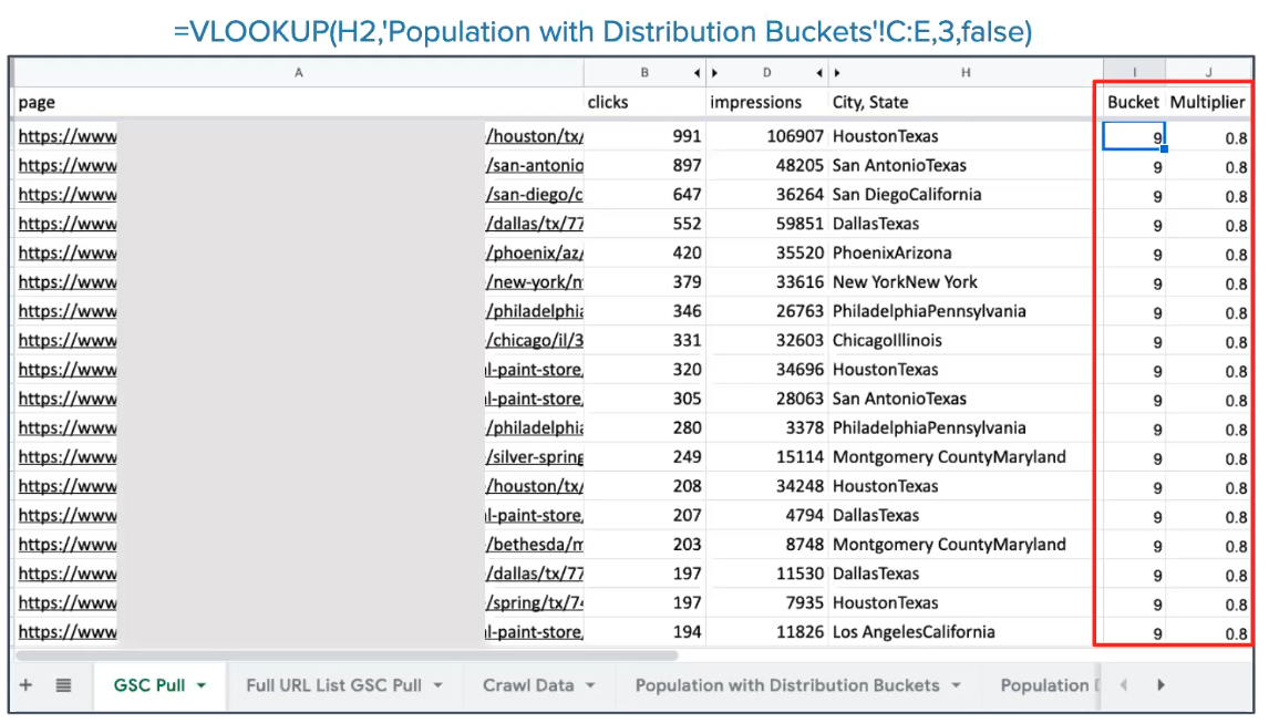 #7. Take the Bucket and Multiplier data and pull it into your GSC data tab.Â