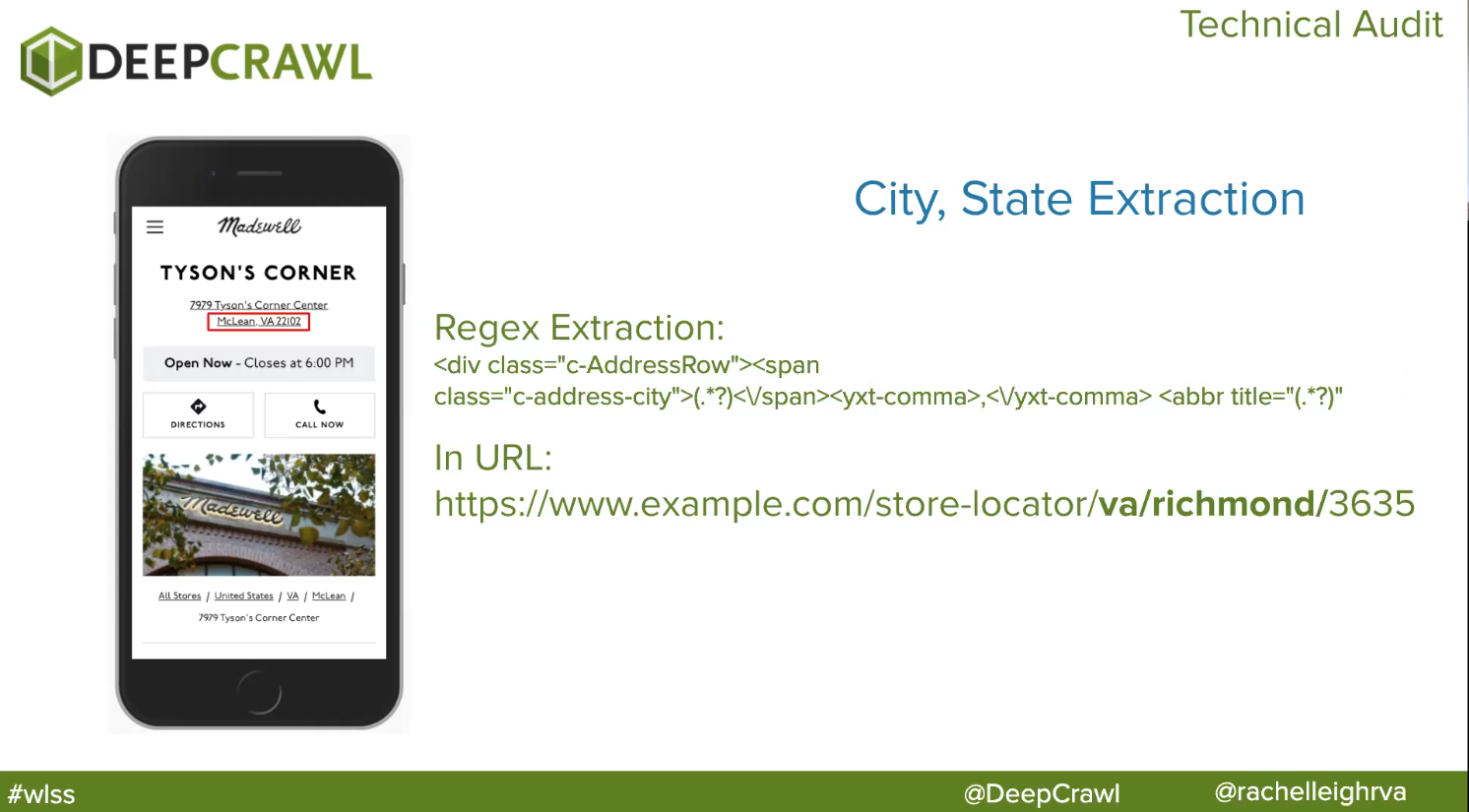 *You may have your city or state name in your URL, title or header – if you do, you’re fine. If you don’t, you’ll need to use a Regex Extraction (or XPath) to pull in the city and state information.Â