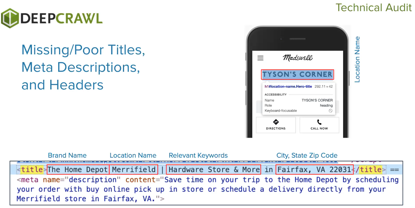 We see missing titles or titles that only have the brand name all the time. The Home Depot is an example of a really good title. It has the brand name, location name, relevant keywords, and location with city, state and zip code. It’s critical to have all these identifying information elements in your titles.Â
