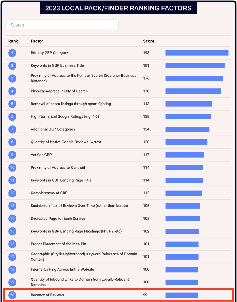 In the 2023 Local Search Ranking Factors, Review Recency ranks as the #20th most valuable local ranking factor.