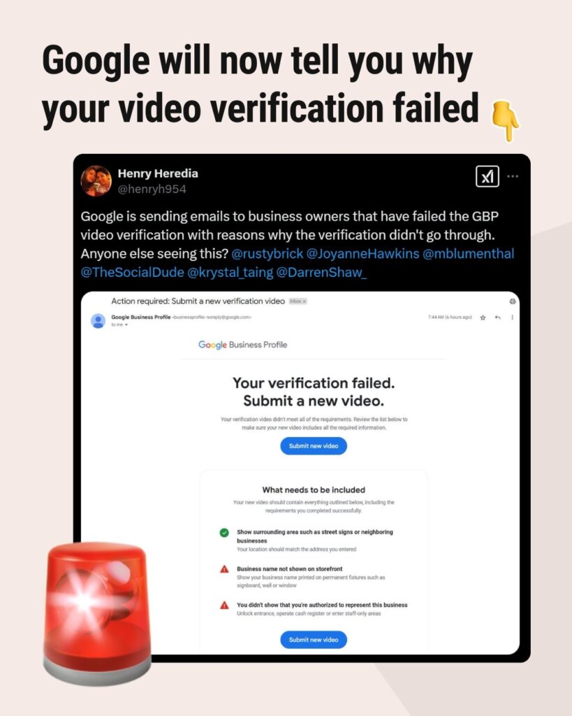 In the past, business owners had little or no idea why their video verification had failed. Now, Google will let you know what you need to include in order to pass verification.