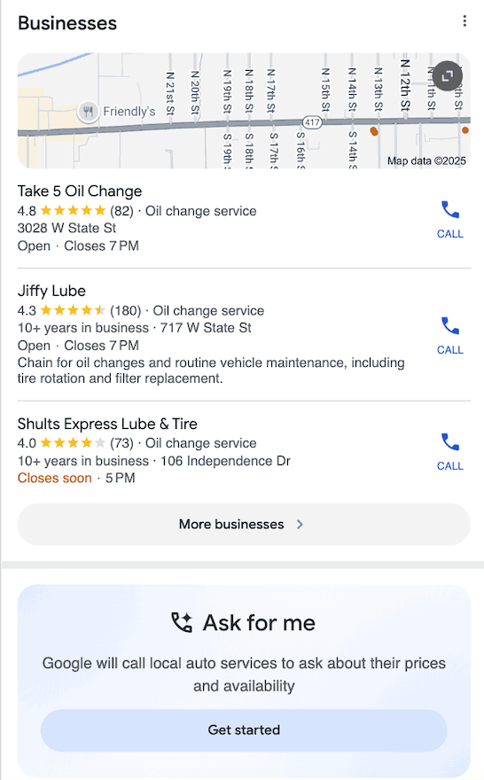 Not to be confused with Ask Maps, the Ask for me feature is one Mike Blumenthal has been testing out in Google Search Lab, and you can read his complete write-up here. Mike used this assistant technology to try to book an oil change and the product called businesses and returned him information about his nearby options over the course of about 17 minutes. He calls the test “quick, easy and impressive technology, but it is not at all clear that it is good for small businesses.”