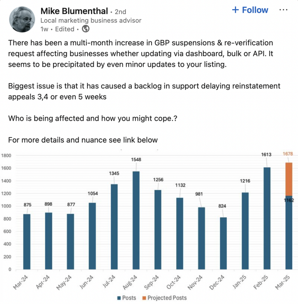 Mike Blumenthal has charted a significant increase of GBP suspensions and re-verification requests in Q1, and the bad news here is that support is backed up at Google and your reinstatement may not receive a response for as much as 5 weeks. Mike’s more detailed account at Near Media captures the frustration I’m hearing from multiple Google Business Profile Help Community Product Experts that the company has yet to provide any explanation of the delay or time frame for more efficient support. I can only advise patience, and empathize with how frustrating it is when an unearned suspension is impacting your real-world business, and you’ll have to wait weeks for resolution.