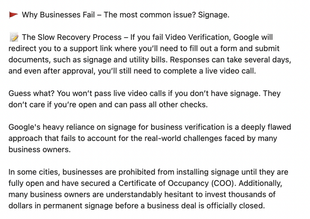 I highly recommend reading Claudia’s whole post so that your business or clients can be better prepared to pass video verification. Too often, we see cases in which Google’s policies simply don’t meet real-world realities, and I second Claudia’s plea for improvements in GBP verification flow.