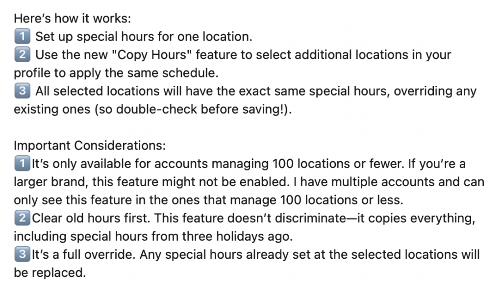Claudia Tomina is on an absolute roll this quarter, turning up new features, like this one for managing special hours if you’ve got fewer than 100 GBPs:
