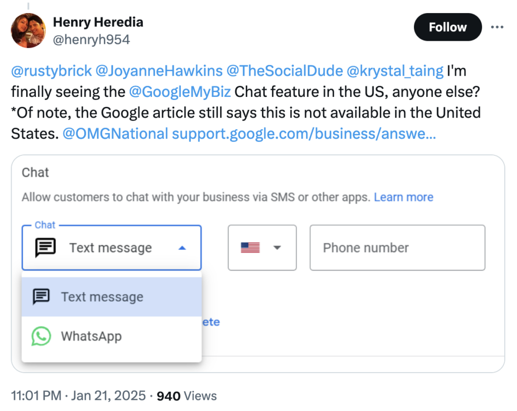 Henry Heredia was the first I saw reporting on the arrival of WhatsAPP as a GBP chat methodology: