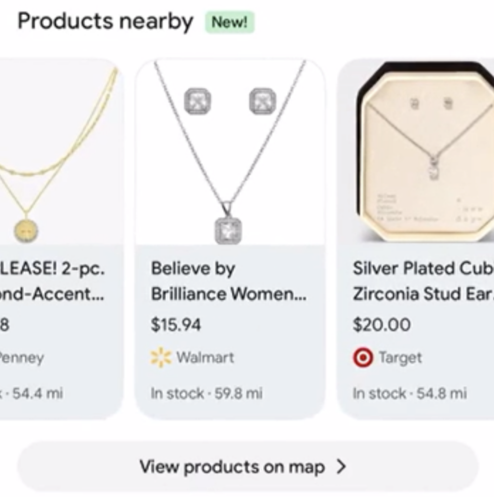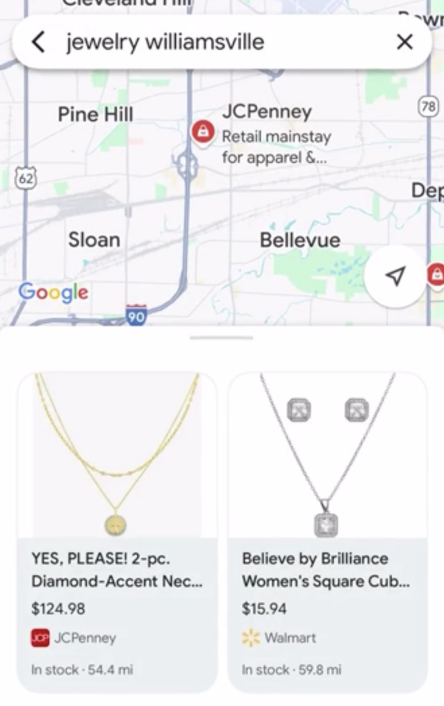 “Do a product type query in GMaps: “Engagement rings Williamsville”. In addition to listings, Google is now showing a Merchant Center carousel feed of products that match the query and are near the query centroid. You can view these on a map by clicking the link below.”