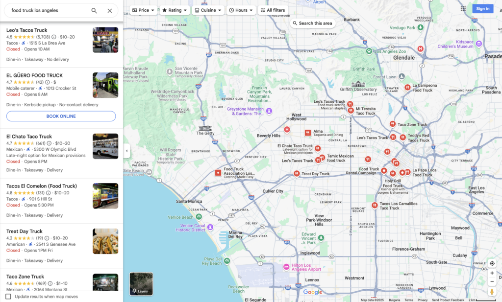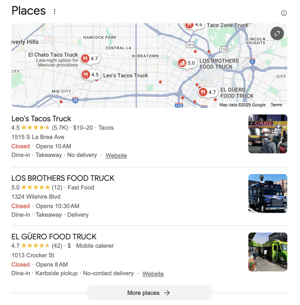 The downside of this choice is that the location of your food truck will be hidden from the public on your GBP and you won’t have a pin on the Map. This may make it hard for potential customers to find you, so you should be sure to link to your website for a full description of wherever your truck is located. You can also use Google Updates (Posts) and social media to publish timely content about the location of your concession.
