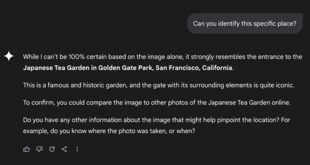 When Darren specifically asked the app if it could identify this place, it said it resembled the Japanese Tea Garden, but that it couldn’t be 100% sure. Now here’s something interesting: when I also went to Gemini and uploaded the image without asking a question, here’s what I got: