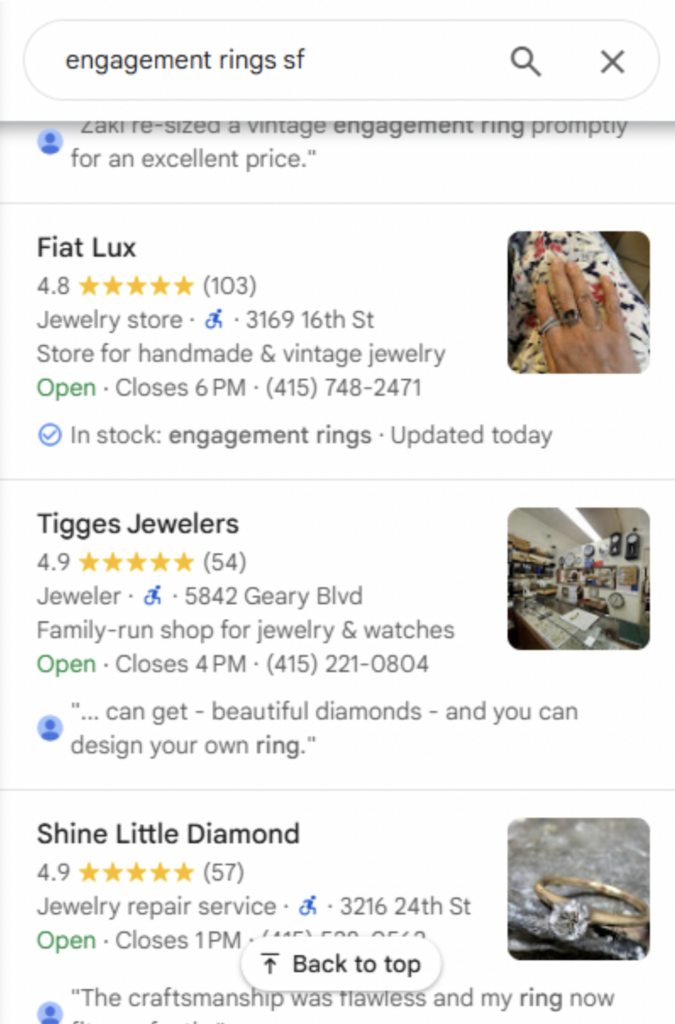 If you are marketing Fiat Lux or Shine Little Diamond, Google has identified a photo in your set which accurately matches this search intent, but if you are marketing Tigges Jewelers, you’ve got a problem to solve. Google cannot clearly distinguish an engagement ring in any of your images, so it can’t customize your listing profile pic to match the searcher’s intent.
