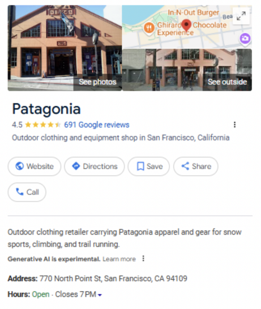 Maybe you’re marketing a busy small business and just aren’t convinced that your limited time budget should be invested in photography, because you doubt it will yield a meaningful return. Maybe your brand is a large, multi-location enterprise and priority hasn’t been given to enabling GBP access to branch managers and franchisees so that they can contribute to marketing on-the-ground. I suspect this is one of the key drivers of GBP image neglect, as I routinely see great brands like Patagonia who have let months go by since they last uploaded new pictures and whose overall photo set is tiny. So much more could be photographed to properly represent this major branch in San Francisco: