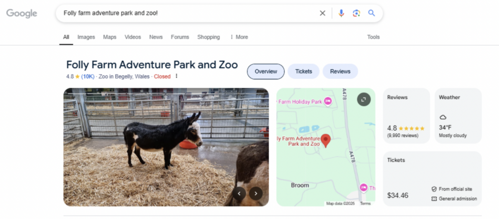 The entire top section of every listing is devoted to visual components, made up of photographs and maps. Not only this, but some landmark-style brands are seeing themselves being treated to the new Brand Knowledge Panel instead of a typical GBP. Last summer my friend Claire Carlile noticed this change for her long standing client, Folly Farm Adventure Park and Zoo, when they started getting a mobile-like display on desktop, with an automatically-rotating slideshow made up of their images: