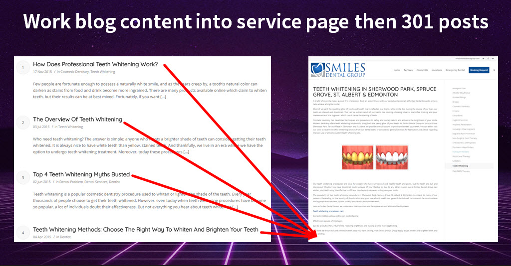 You can take this even further by consolidating your content from your blog to your service landing page an d 301 redirecting it. Now you have an even better service page, that is more informative, and ideally more helpful.