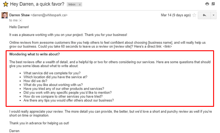Reviews are not only critical to helping your rankings, but they are a must for reputation management. Take your review asking strategy to new levels, by simply adding more details to your request!