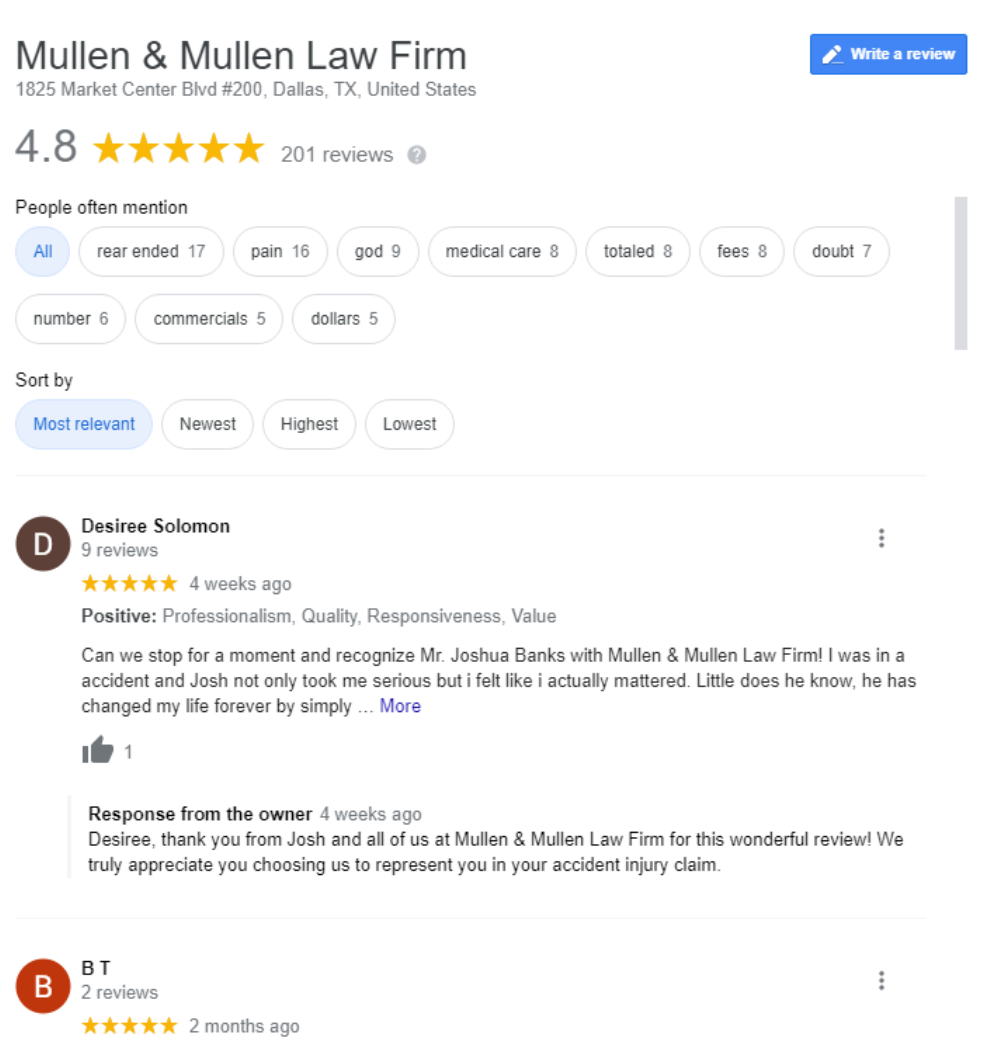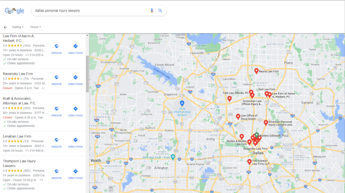 If this was the search results, you’re trying to drive more business for âDallas personal injury lawyersâ, and your business was the âLenahan Law Firmâ with only 13 reviews, you’re very unlikely to get as many calls or clicks as some of these other businesses in the result. âKraft & Associatesâ has 353 reviews. âThompson Law Injury Lawyersâ has 902 reviews. As consumers, people are automatically drawn to the businesses that have more reviews. Not having reviews can definitely negatively impact your rankings and having reviews can positively impact your rankings.Â