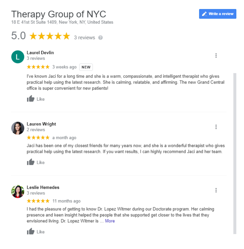 You can ask for a review for your administrative staff, but not necessarily for the therapist because of the code of ethics. There’s also no ethical restriction to asking colleagues, other people that you’ve worked with, to review you online. You see this tactic being used by psychologists too. In this case, this business here has reviews from people that she knows in the industry, people that she went to university with – you can still solicit reviews from people that aren’t your direct clients.Â