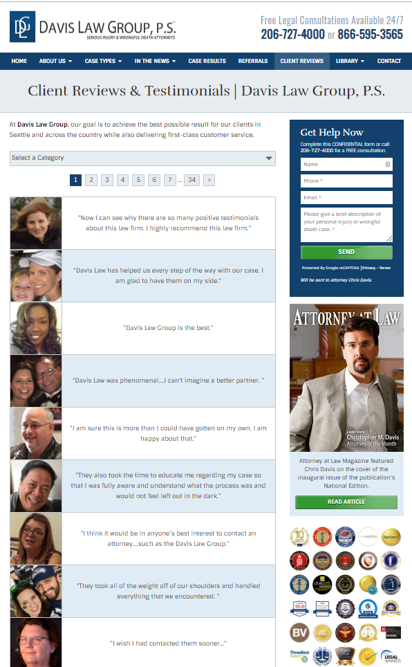 So this is an example of a personal injury lawyer. They’ve got a testimonials page where they’ve pulled all of this fantastic content in, they’ve got like 34 pages of comments from customers, they’ve got their Google reviews getting pulled in. You can use this tactic on a dedicated testimonials page. You can use it on your services page. So if you have a page that is about a specific service, and you’ve got reviews that mentioned that specific service you can add that content to those pages. If you have specific location pages, it’s a great way to drive fresh, unique content to those pages. And it’s the kind of thing that keeps coming in as long as you continue to ask. You’re providing a fresh feed of keyword rich content on all these pages, itâs really valuable.Â