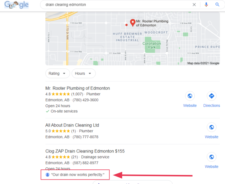 Another significant reason why you really want to invest in reviews is that Google will often pull in little snippets from the reviews into the search results when they match the searcher’s query. So for example, in this query, I searched for âdrain clearing Edmontonâ and this business –âClog ZAP Drain Cleaning Edmonton $155â (I don’t know why they have that in their business name, but) – they’re getting the text âour drain now works perfectly,â pulled in from the reviews that someone had written.Â