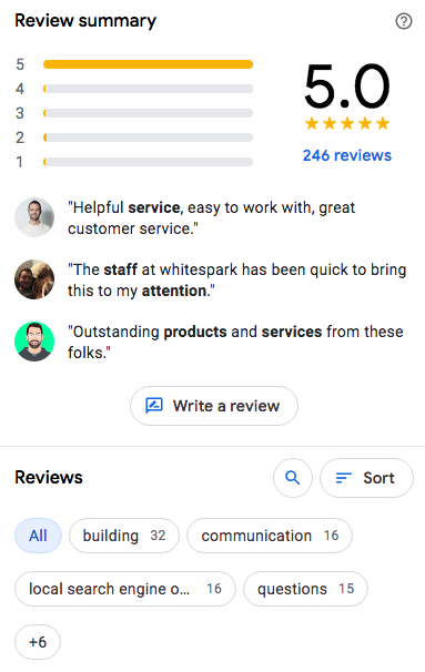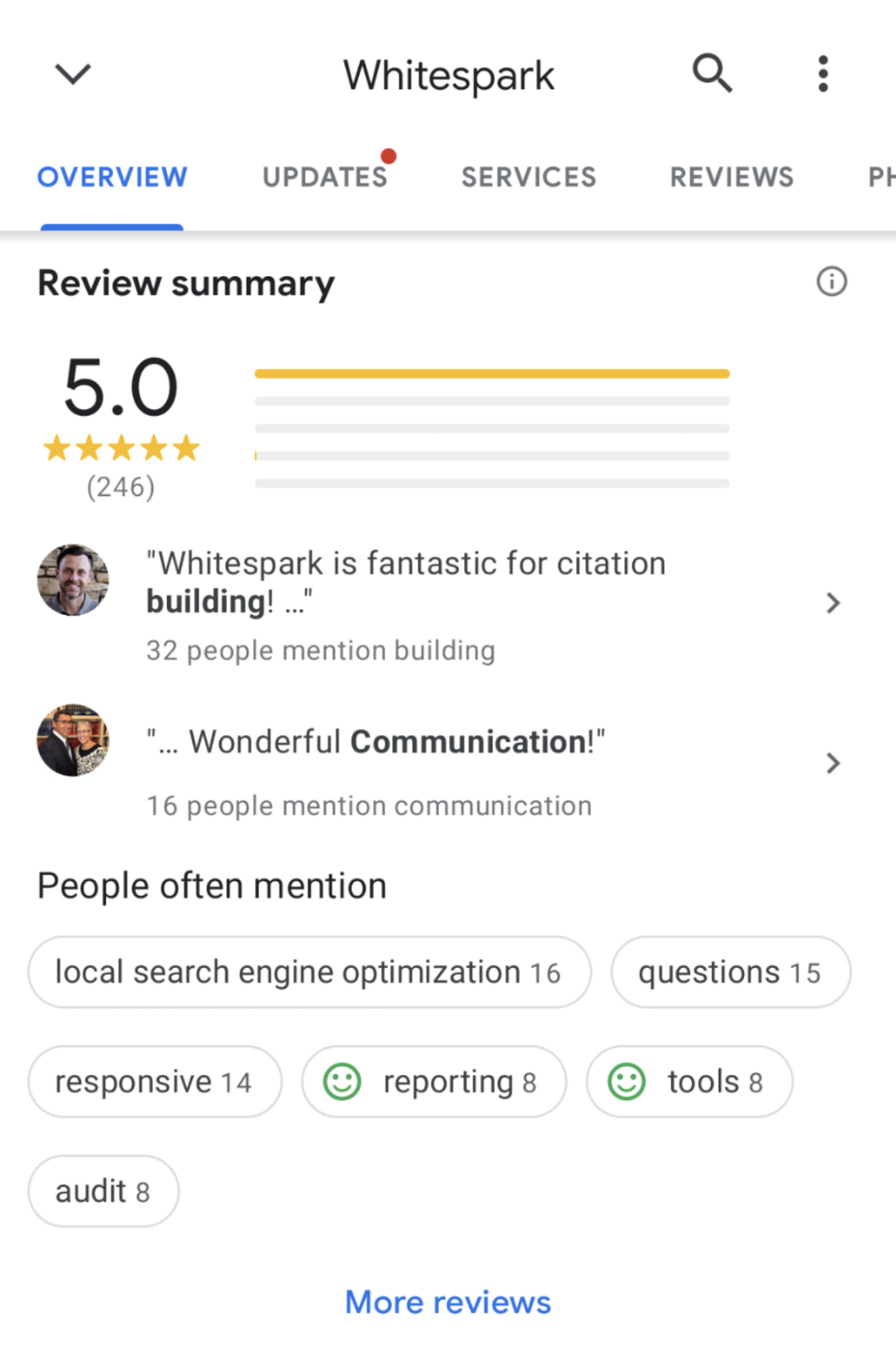 For several listings we tested, the featured reviews changed to the most-mentioned Place Topics structure in Google Search, but have not changed in Google Maps. For example, Whitespark’s Google My Business listing’s featured reviews are different on Search and Maps. On Search, the featured reviews follow the new most-mentioned Place Topics structure. But on Maps, the featured reviews have not changed. Maps