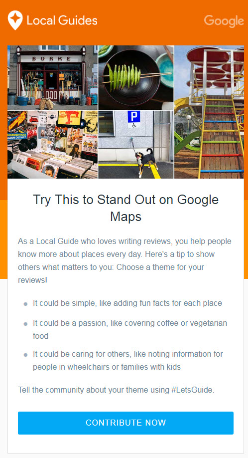But we can make it even better. It’s interesting, because I was inspired to do this from an email I got from Google. I saw this email from Google. They sent it out to all the local guides. They’re trying to help your review stand on our maps. So they provide some simple directions on what you can do to improve your reviews, like you can mention fun facts for each place. You can talk about, you know, whether they specialize in coffee, or vegetarian food. You could note information for people in wheelchairs, or families with kids.