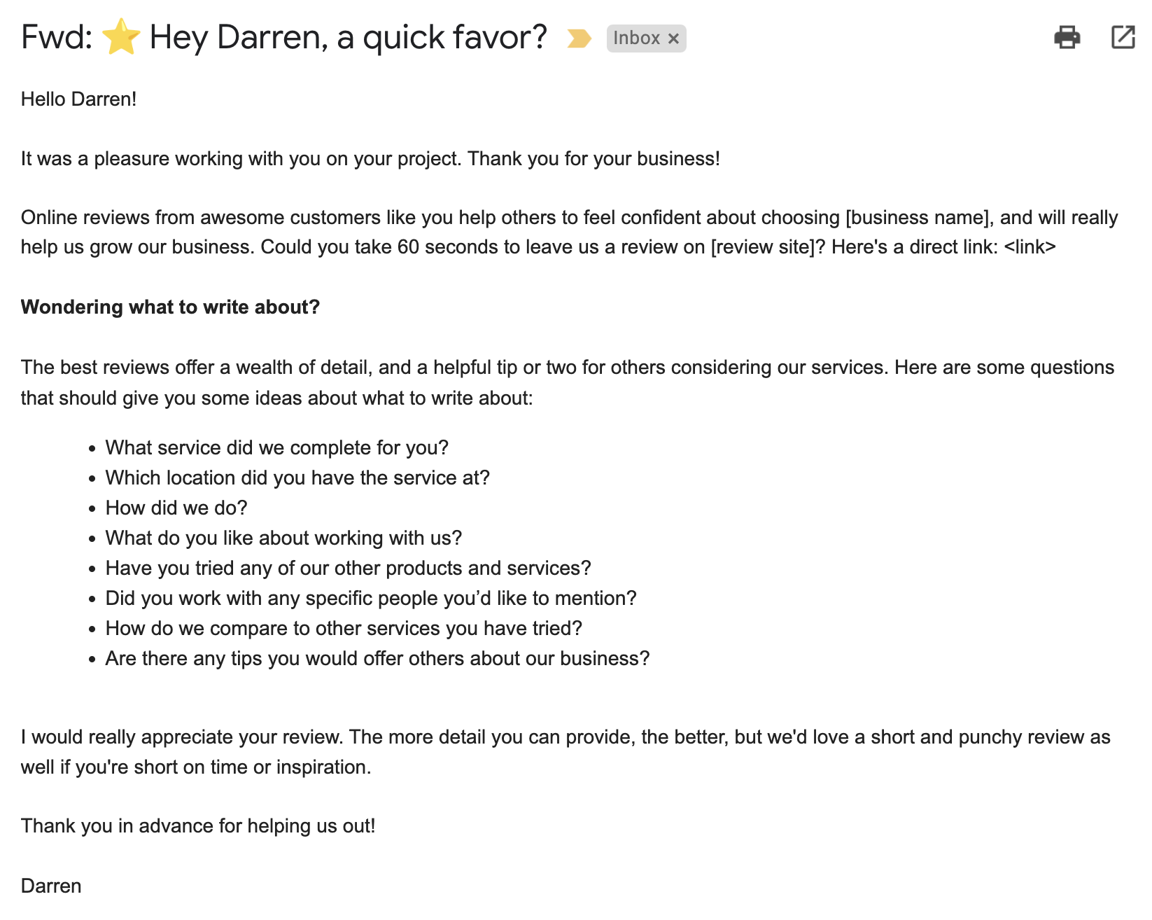 You give them some incentive for why they would leave the review, and have the quick ask, you know, “Could you leave us a review?” You want to link to the review site and provide a direct link. “I’d really appreciate it. Thanks, for helping us out.” That’s pretty good. I think it’s gonna help encourage reviews.