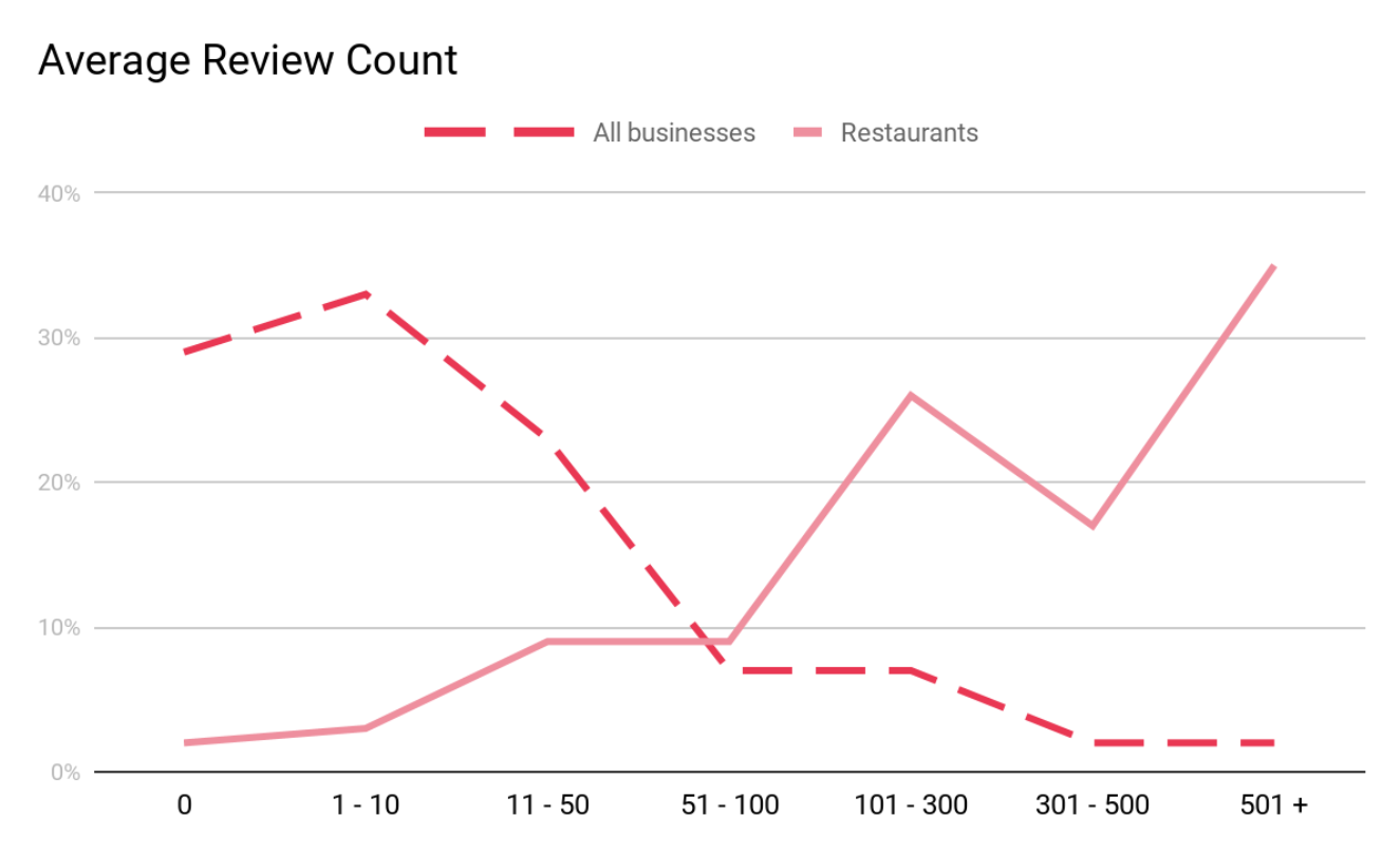 We measured which businesses are best at collecting reviews as those least likely to have no reviews. Very few locksmiths, day spas, bakeries and coffee shops have no reviews and only 2% of restaurants studied did not have at least one review.