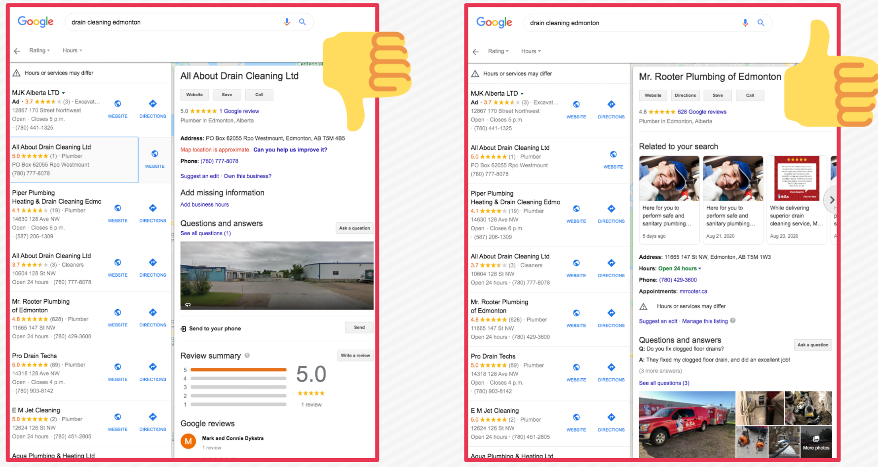Below, we compared two businesses in the local finder for the search term “drain cleaning Edmonton”. On the left is the top ranking business, on the right is another business that ranked fourth for our query.