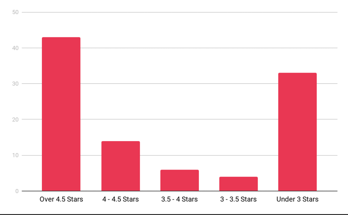 But the majority of businesses have less than 10 reviews. 62% of the businesses we studied have 0 to 10 reviews, only 11% had more than 100 reviews.