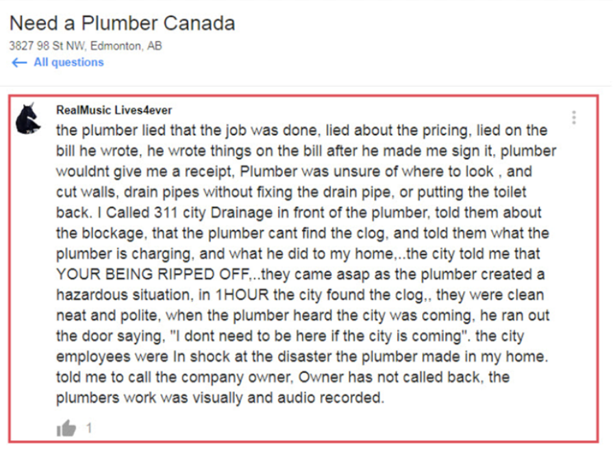 The top ranking business is getting major ranking benefits from our search term “drain cleaning” being included in their business name “All About Drain Cleaning Ltd.” When we look at the listing though, there’s only one review, there’s a warning message that Google isn’t even sure about the location, it isn’t claimed, and it’s missing basic business information.