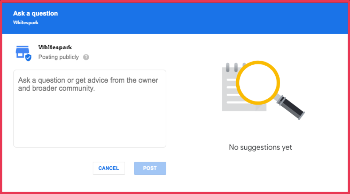This feature oddly isn’t accessible from the GMB dashboard. As the business owner, you can access Q&A from your business listing on your branded search results page. From here, you can answer questions as the business and post a frequently asked question and answer.