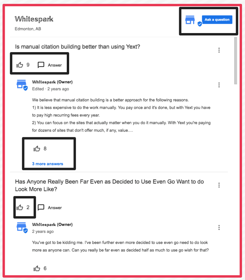 You can also upvote questions and answers. The question with the most upvotes will be the top question (and three upvotes will promote a question to the business profile). If there are multiple answers to a question, the answer with the most upvotes will be the top answer.