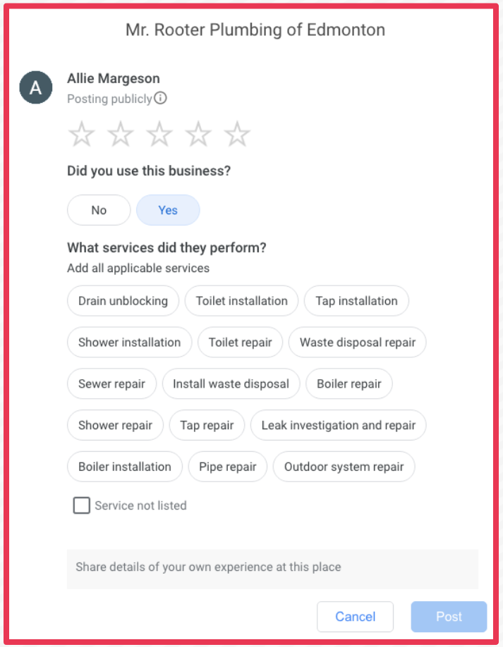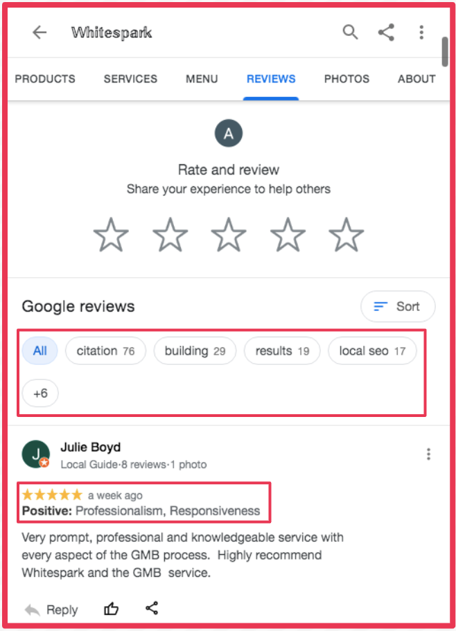 There are some new features that have rolled out over the past year, including Review Attributes (spring 2020) and Place Topics (July 2019). Some businesses even have the new feature below, which asks the reviewer questions including what service they’re rating.