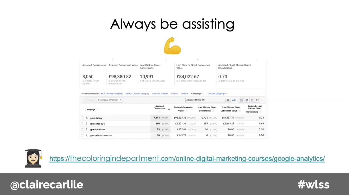 Assisted conversions attributed to ÂŁ95,000 within a look-back time frame of 30 days prior to the conversion. In the 30 days prior to the conversion, the GMB website link contributed to the conversion journey of 7,483 conversions. It’s important to consider the Google My Business links and you need to think about their role in exposing your potential customers to your brand in the early stages of the customer journey, as well as the GMB role in supporting and driving consideration in the middle of the funnel.