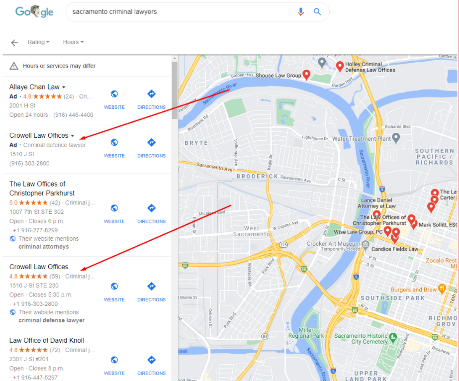 We’ll look at Crowell Law Offices. They’ve got an ad and boom they’re ranked number two. That’s not how it works. It’s just coincidental. They also seem to care about SEO and PPC. So, they’re doing both, but one does not impact the other in any way.