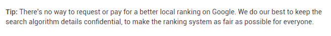 Google has even said, “There’s no way to request or pay for better local rankings on Google. We do our best to keep the search algorithm details confidential, to make the ranking system as fair as possible for everyone.”