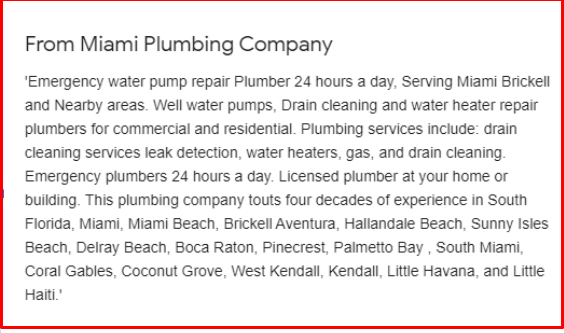 This is a big one. Oh my gosh, I hear this all the time, “Keywords in the Google My Business description impact rankings.” People think this will work and think Google gives me this field for the description so I’m just going to stuff that with keywords, like this company with the description “Miami plumbing company, Miami plumbing company, emergency water repair serving Miami, and nearby areas, water pumps, water heater repair, plumbers, commercial residential Plumbing Services”. Anyway, they go on and on with all the different services. You see this quite regularly in GMB listings. They are wasting that space because Google does not look at that field for ranking purposes. I’ve tested it. So many people have tested this. Put whatever you want in there, Google does not consider it for ranking.