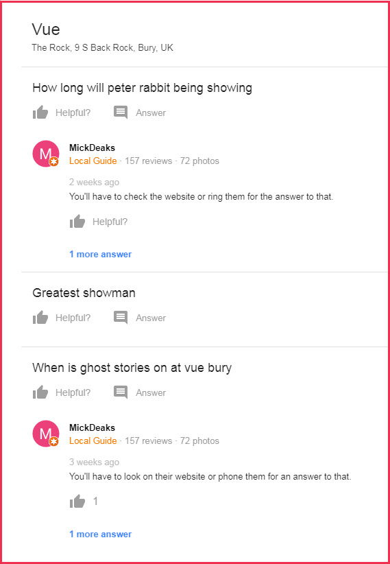 Another thing that you’ll see in Q&A are just really dumb questions.People asking things like, “What is this?” That’s not even a question. “Greatest Showman.” Why did someone put that into Google Q&A? “What movies are playing right now at your theater?”