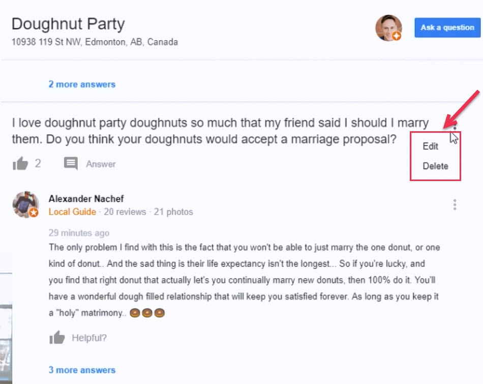 Another thing you can do is if you’ve got these really negative ones, sometimes, it goes back to how you would deal with negative reviews. Oftentimes, when you get a negative review, if you put in the effort and you show the customer that you care, you can get them to either edit or delete their negative review. Let me just show you this. Just to make sure that you can edit or remove, I left a question for Doughnut Party, and I asked if these donuts would accept a marriage proposal. Since I left it, I could either edit my question or I can delete. And I just see that someone has responded there.