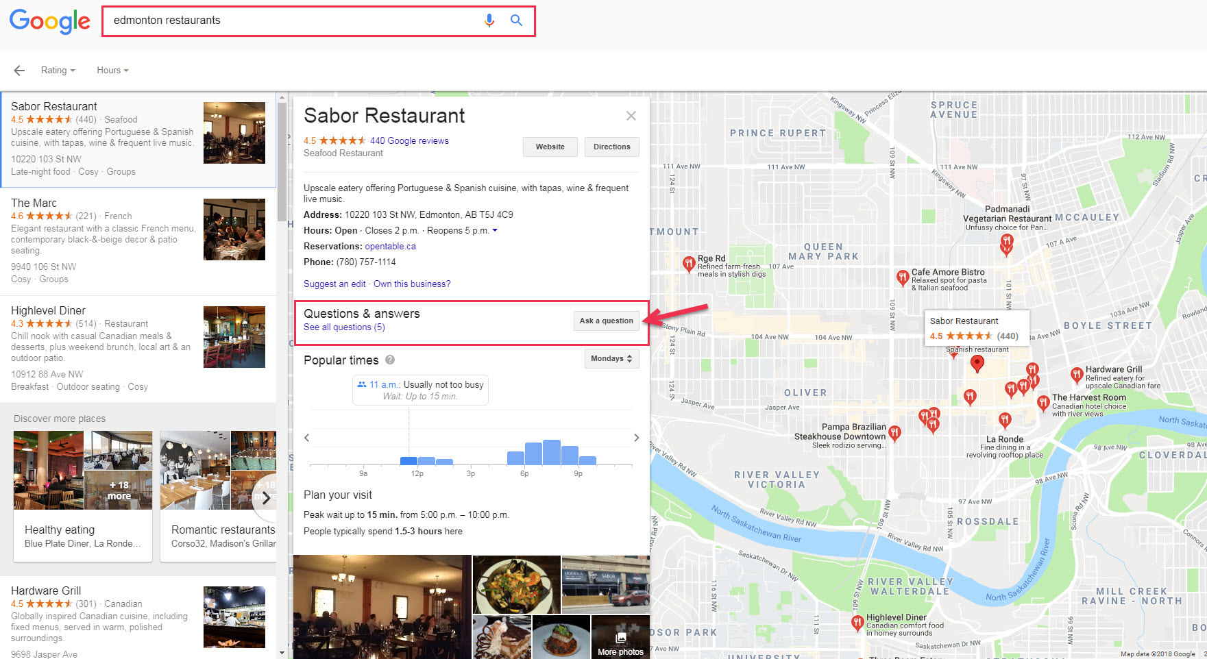 But it also shows up if people are researching businesses. If they’re searching through the Local Finder, so, for example, let’s say they search for, Edmonton restaurants, let’s check that out. Now if I’m looking at these restaurants and I’m browsing through them on Google, as I click them here, you’ll see the Q&A will show up right over here.