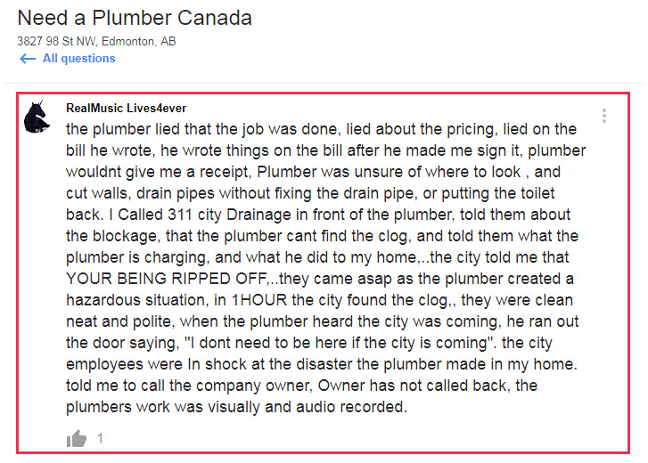 Here’s a plumber at Edmonton. Someone was complaining that the plumber lied about the job, lied about the pricing, lied about a whole bunch of things. You’re being ripped off. It’s a massive reputation issue.
