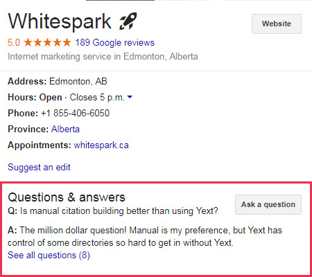Well, it’s really visible. It shows up all over the place. For example, this is the Whitespark listing. If you look over here on the right, in the Knowledge Panel, you can see that we have the Q&A showing up very prominently right in our Knowledge Panel. That’s an important reason why you want to make sure it’s there.