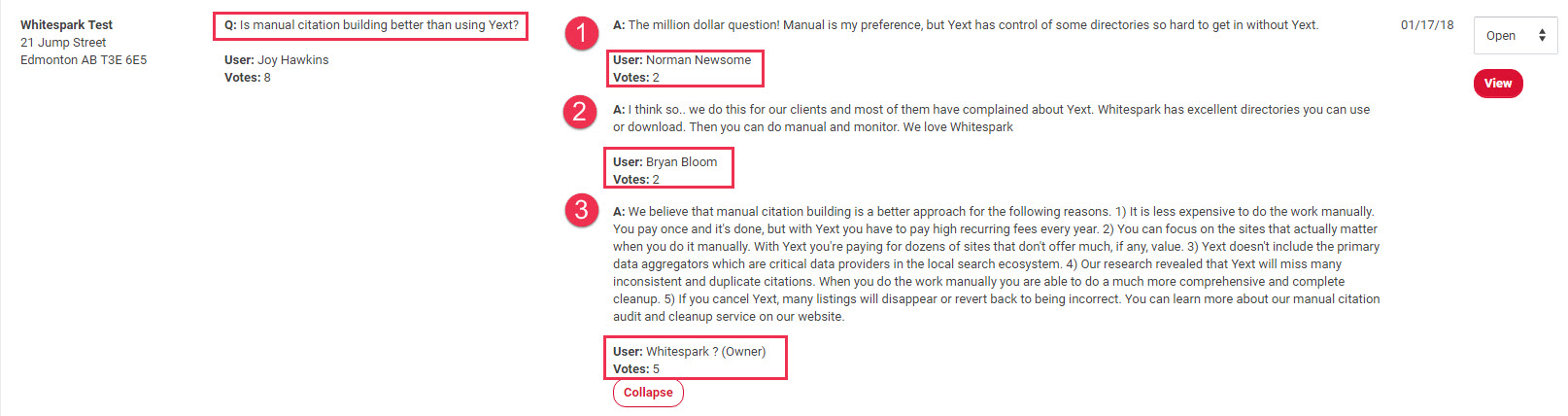 I also want to talk to you about the potential for up-voting specific questions. If I look at Whitespark’s listing, someone asked the question, “Is manual citation building better than using Yext?” Now, since we do manual citation building, that was a great question. I was very happy that someone asked it.