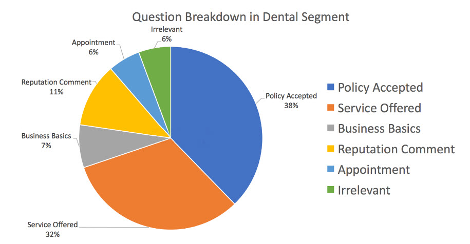 GetFiveStars, and Mike Blumenthal told me he did this research. They looked in the dental segment at what types of questions were being asked. A lot of people were asking about, “Do you accept a particular type of insurance?” They had a few relevant questions like, “Can I book an appointment?” Reputation, that’s where people are giving reviews. Basically, it’s about the business like hours of operation and services. That’s a big one. We see that, too.