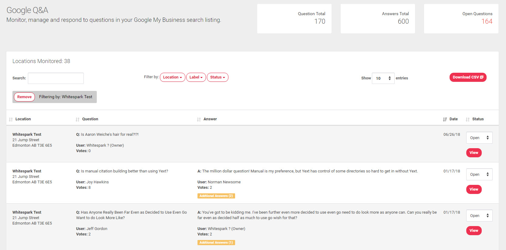 This feature gives you the ability to see all of your locations’ questions and answers in one place. This is a HUGE win for multi-location businesses and digital marketing agencies who need to get all of this information in one place.
