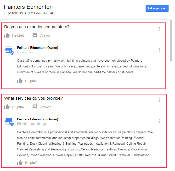 Another thing that I really recommend all businesses should be doing is seed the Google Q&A with your own questions. So many businesses have this opportunity, and I’ll show you an example. Is this it? Painters Edmonton, they have done this. It was one of the few I’ve been able to find where they have taken the initiative to actually seed all the questions.